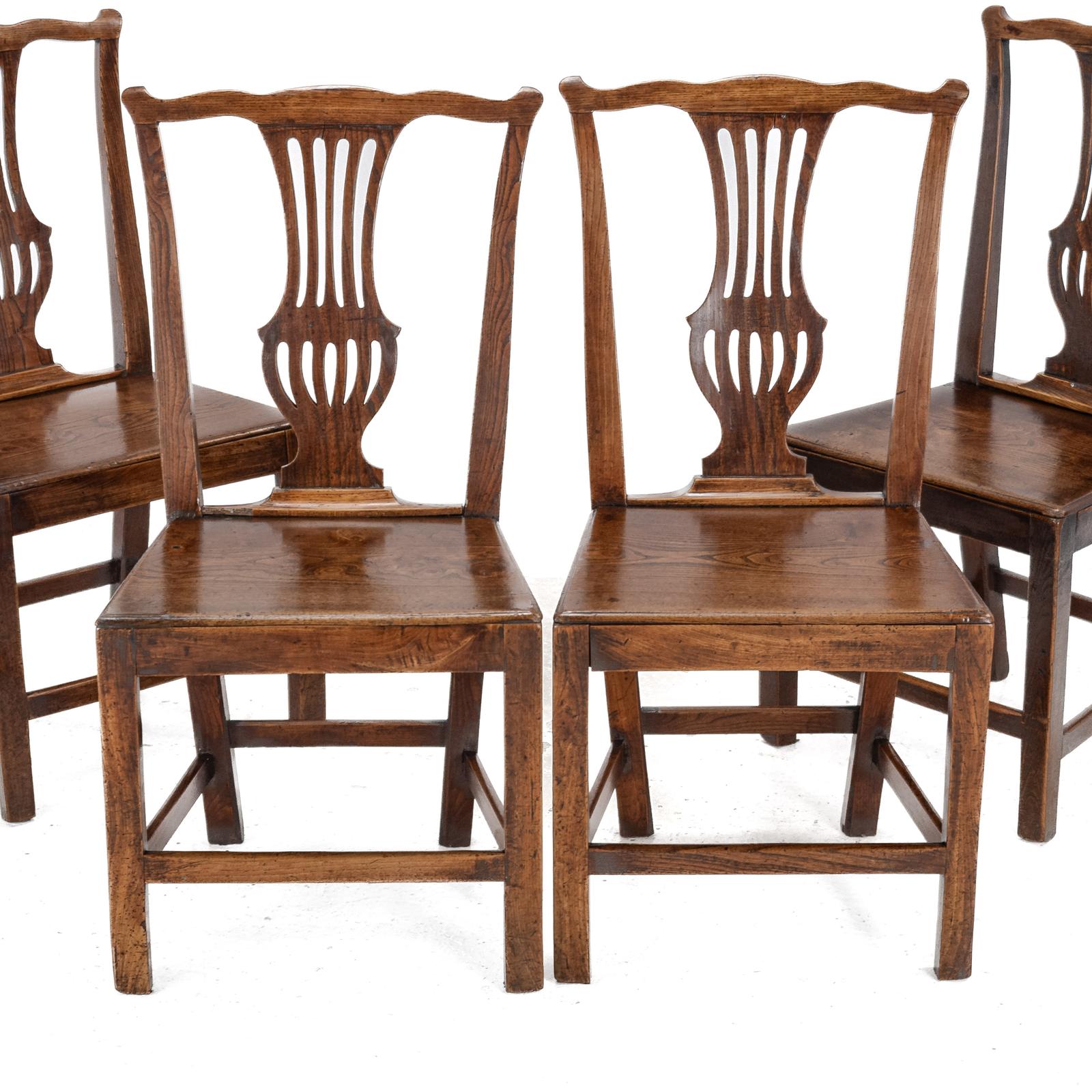 A fine set of four Georgian elm dining chairs, dating from the late 18th century, George III period.